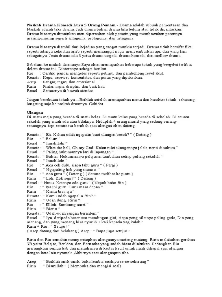 Tugas drama anekdot 5 orang naskah drama 5 orang tema. 13+ contoh naskah drama komedi, persahabatan, cinta | 5, 6, 7 orang. Naskah drama 5 orang tentang meraih mimpi. Yuk simak beberapa contoh naskah drama singkat berbagai tema untuk 2, 4, 5, 6 atau 7 orang. Bagi anda yang sedang membutuhkan contoh teks drama religi sebagai .