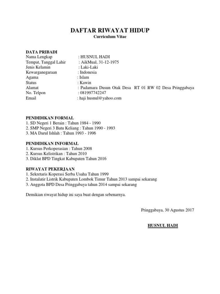 Daftar riwayat hidup calon taruna. Pendidikan formal (dari terendah sampai dengan tertinggi). Selain pendidikan formal, pendidikan nonformal yang pernah kamu tempuh juga perlu . Kemudian, bila pernah mengikuti pendidikan informal, dianjurkan juga untuk disertakan ke dalam daftar riwayat hidup. Selain surat lamaran kerja, tentu anda juga membutuhkan yang namanya cv (curriculum vitae) untuk melamar sebuah pekerjaan.