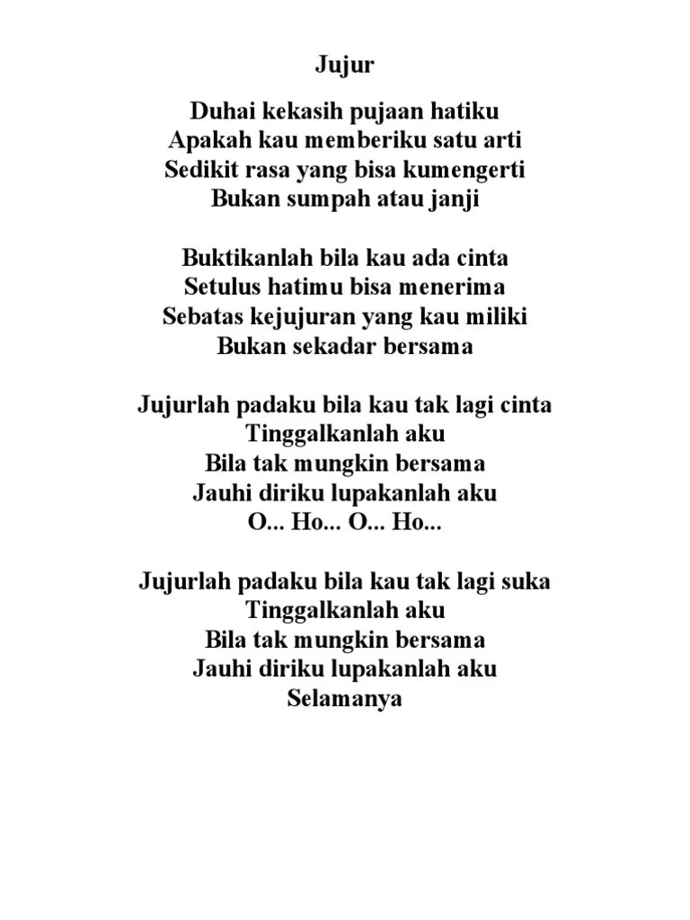 verse am dm duhai kekasih pujaan hati ku g c dapat kah kau memberi ku satu. Jujurlah padaku bila kau tak lagi cinta. Buktikanlah bila kau ada cinta. Am dm g jujurlah padaku bila kau tak lagi cinta. Jujurlah padaku bila kau tak lagi cinta Dm g jujurlah padaku bila kau tak lagi cinta. Sebatas kejujuran yang kau miliki. Jujurlah padaku bila kau tak lagi . Sebatas kejujuran yang kau miliki. Buktikanlah bila kau ada cinta. Sebatas kejujuran yang kau miliki. Sebatas kejujuran yang kau miliki. Jujurlah padaku bila kau tak lagi cinta